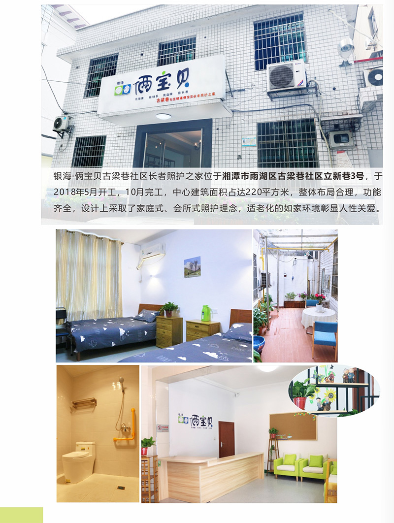 銀海·倆寶貝古梁巷社區(qū)長(zhǎng)者照護(hù)之家位于湘潭市雨湖區(qū)古梁巷社區(qū)立新巷3號(hào),于2018年5月開工,10月完工,中心建筑面積占達(dá)220平方米,整體布局合理,功能齊全,設(shè)計(jì)上采取了家庭式、會(huì)所式照護(hù)理念,適老化的如家環(huán)境彰顯人性關(guān)愛。
