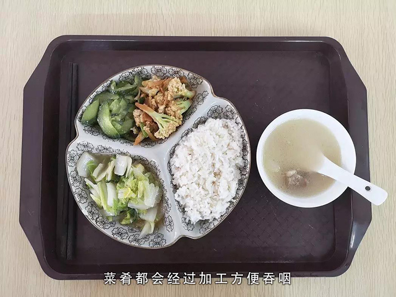 院內(nèi)廚房現(xiàn)做的午餐,美味可口,營養(yǎng)均衡。菜肴都會經(jīng)過加工方便吞咽,而且還可以選擇少放鹽的健康套餐。