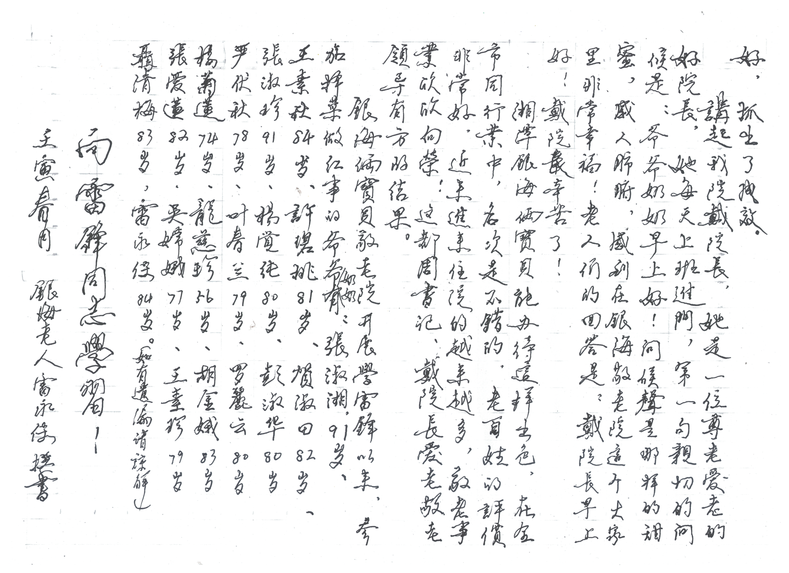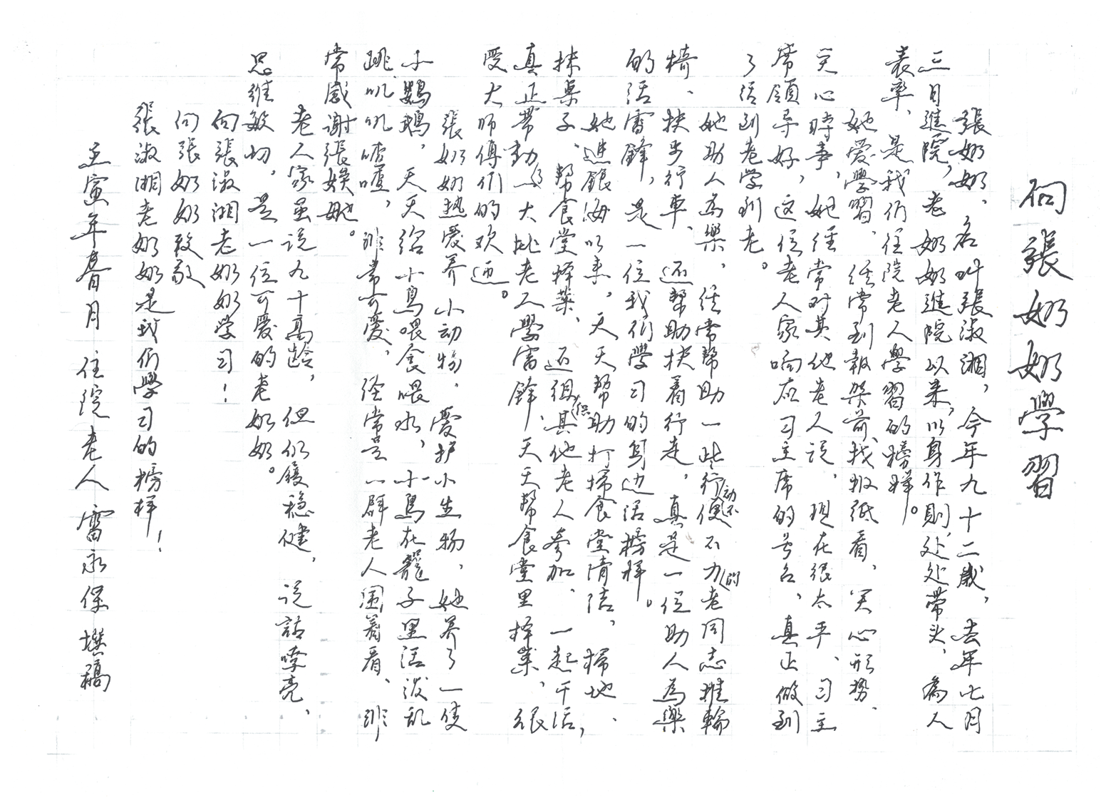 張奶奶,名叫張淑湘,今年九十二歲,去年七月三日進(jìn)院,老奶奶進(jìn)院以來,以身作則,處處帶頭,為人表率,是我們住院老人學(xué)習(xí)的榜樣。