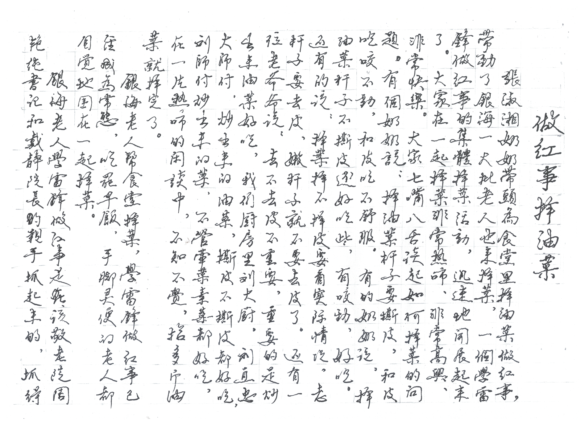 張淑湘奶奶帶頭為食堂里擇油菜做紅事,帶動了銀海一大批老人也來擇菜,一個(gè)學(xué)雷鋒做紅事的集體擇菜活動,迅速的開展起來了。大家在一起擇菜非常熱鬧、非常高興、非常快樂。大家七嘴八舌談起如何擇菜的問題。有個(gè)奶奶說:擇油菜桿子要撕皮,和皮吃咬不動,和皮吃不舒服。有的奶奶說:擇油菜桿子不撕皮還好吃些,有嚼勁,好吃。還有的說:擇菜,擇不擇皮要看實(shí)際情況,老桿子要去皮,嫩桿子就不要去皮了。還有一位老爺爺說:去不去皮不重要,重要的是炒出來油菜好吃。我們廚房里劉大廚,炒出來的油菜,撕皮不撕皮都好吃,劉師傅炒出來的菜,不管葷菜素菜都好吃。在一片熱鬧的閑談中,不知不覺,拾多斤油菜就擇完了。