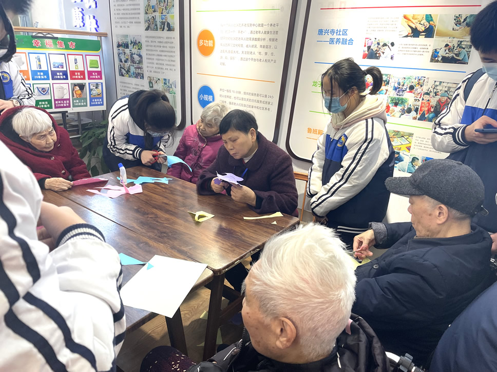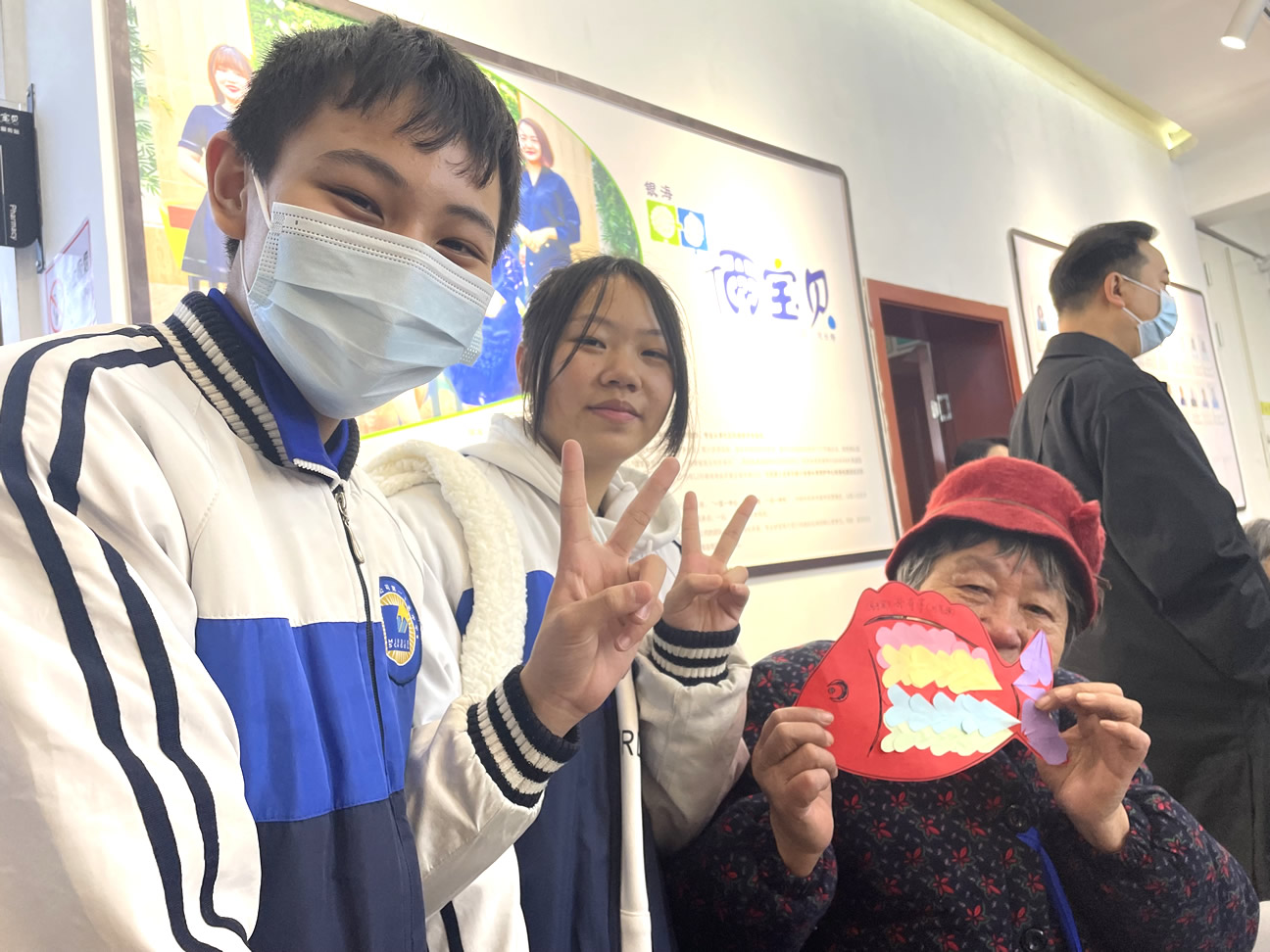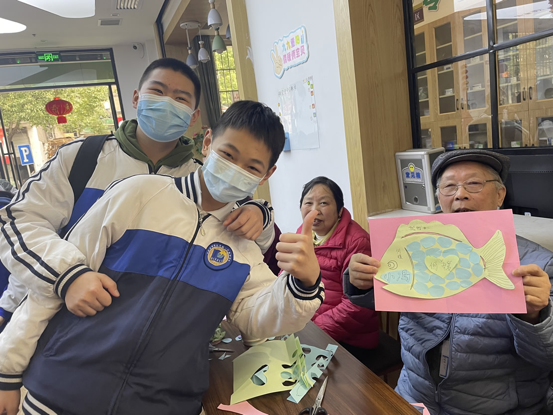 “爺爺,您喜歡這個顏色是嗎?下面我?guī)椭黄鸢阉舫鰜砗脝??”、“奶奶,您平常都有些什么愛好呀,可以跟我們說說您的故事嗎?”……只見同學(xué)們有的蹲坐在老人旁邊,有的則是伏耳于他們面前,耐心認(rèn)真地和爺爺奶奶們進行交流,其他的人則是分工協(xié)作,完成“魚”的其他部位制作。不多久,一條條色彩斑斕,創(chuàng)意十足的“魚”就做好啦!爺爺奶奶們拿著完成的作品分別和自己的“小伙伴”們合影留念,再次感謝他們的到來!
