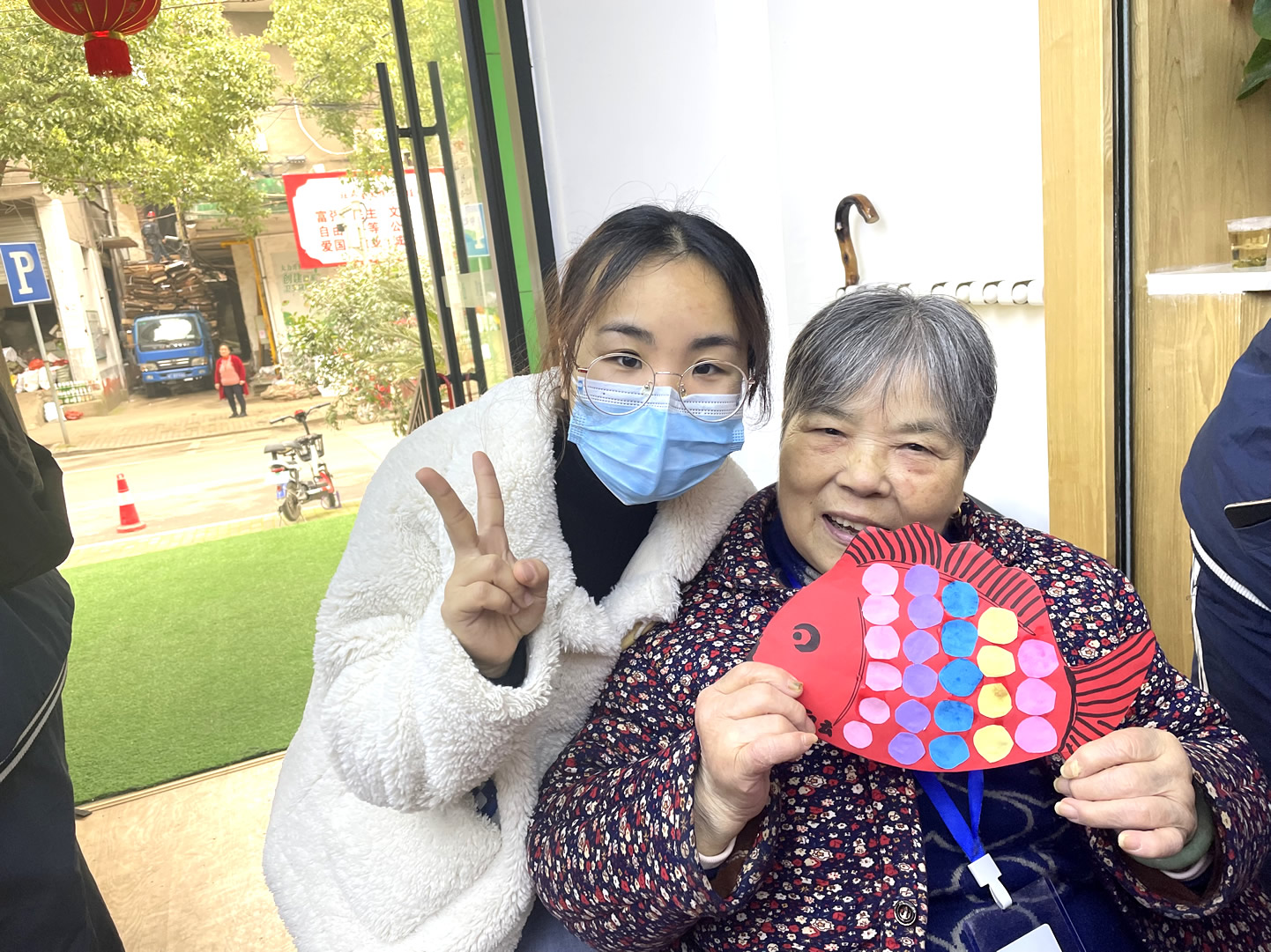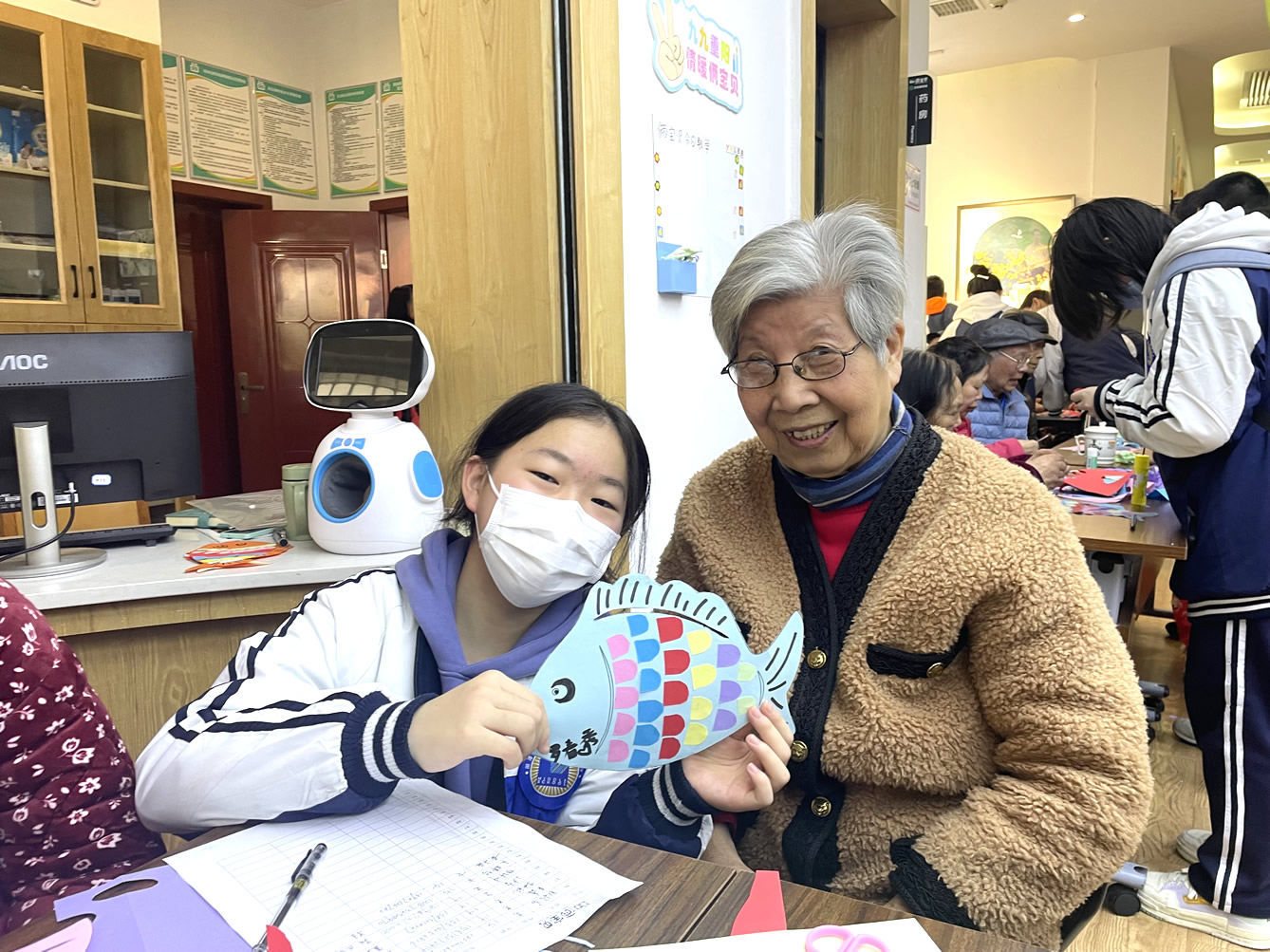 “爺爺奶奶們好!”還未瞧見人一聲聲清脆響亮的問好聲便已傳了進來,在老師及工作人員的組織下同學(xué)們有序進入到院內(nèi)并配合做好疫情防控登記。不一會兒,同學(xué)們陸續(xù)找到爺爺奶奶進行自我介紹,并以一對一的形式來協(xié)助他們完成今天的手工作品“年年有魚”。