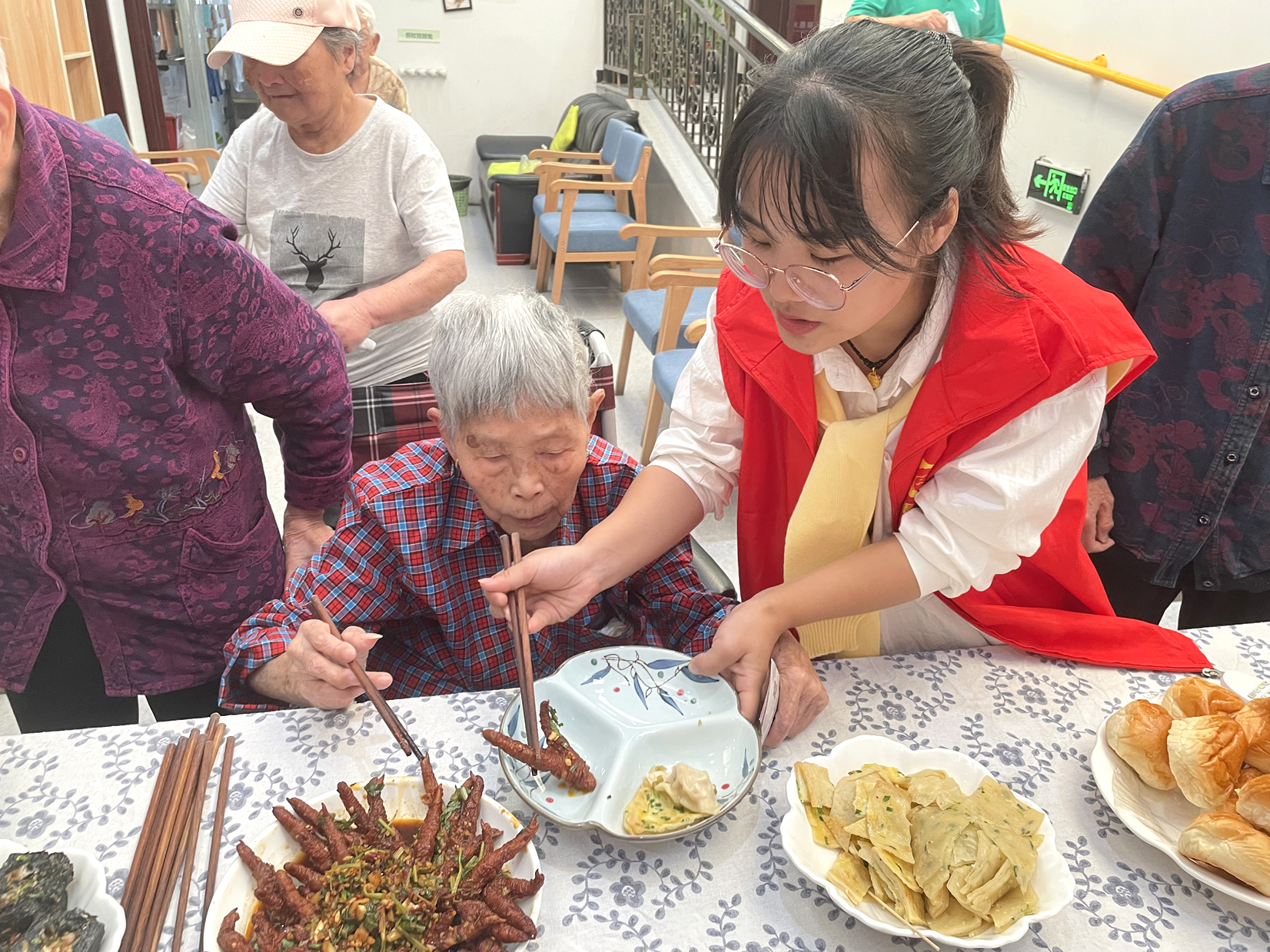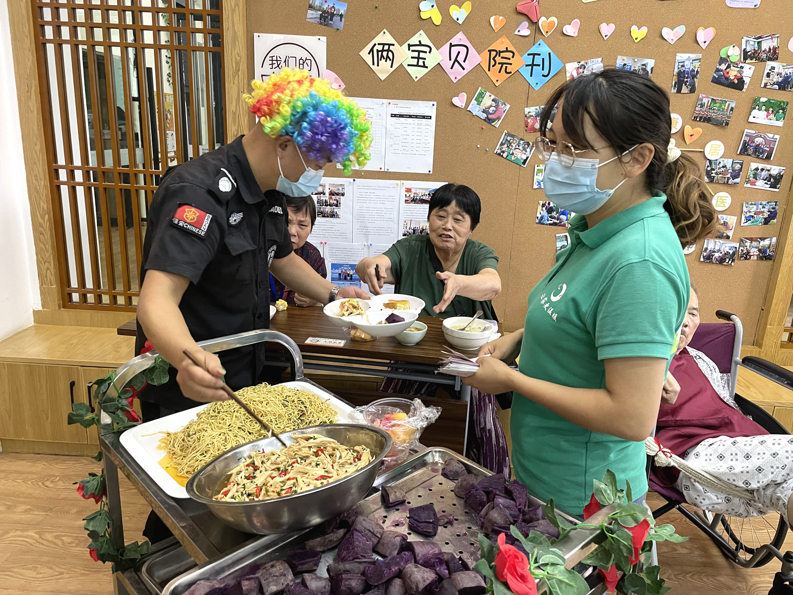 現(xiàn)場食物十分豐富,有重陽花糕臭干子、虎皮鳳爪小籠包、餛飩、蒸餃、涼面、炒粉、蒸玉米、紫薯、油條、涼拌菜、水果拼盤等美食陸續(xù)端上來,格外美味的各種小吃,種類繁多,色香味俱全。爺爺奶奶們每天吃食堂的飯菜,時不時換點新花樣,都很高興,想吃什么,用手上的幸福幣直接購買就行。爺爺奶奶們一邊感受著自己賺錢自己花的快樂一邊品嘗著喜歡的小食,整個現(xiàn)場其樂融融、熱熱鬧鬧。行動不便的爺爺奶奶們也沒關(guān)系,工作人員送到身邊隨他挑選。