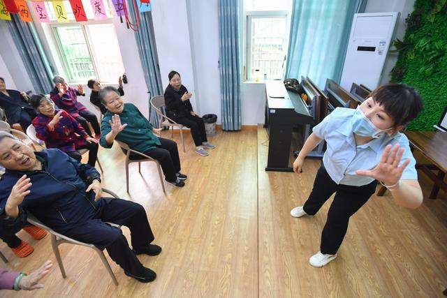 劉夢(mèng)帶著老人練習(xí)音樂(lè)手指舞。