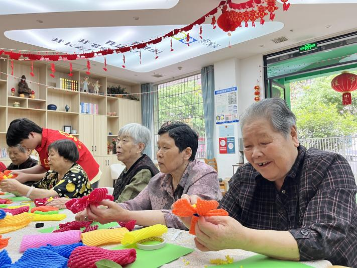 社工們精心布置了場(chǎng)地,準(zhǔn)備了充足的材料,安排老人們就坐。隨著講解員講解制作方法,長(zhǎng)者們紛紛挑選了各自喜愛(ài)的顏色,開(kāi)始制作。他們小心翼翼地將泡沫網(wǎng)套剪出花瓣形狀,精心打磨邊緣,確保每一片花瓣都邊緣光滑且大小形狀一致。在這個(gè)過(guò)程中,爺爺奶奶們互相交流技巧,彼此協(xié)助,現(xiàn)場(chǎng)氣氛溫馨而活躍。